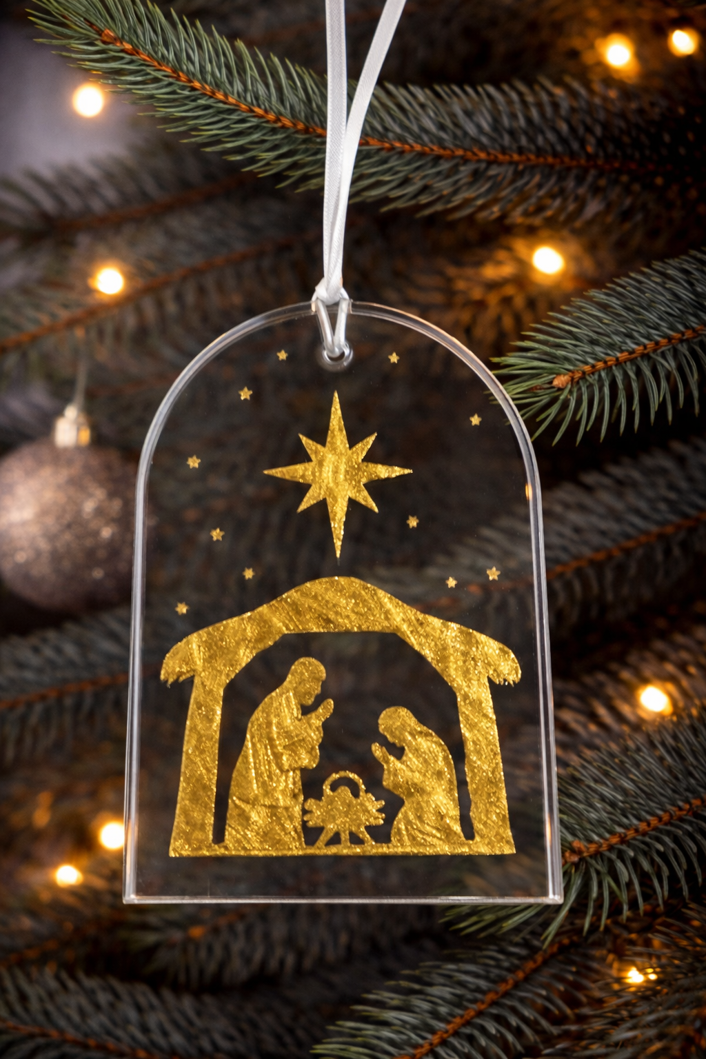 Celebrate the magic of the season with this sparkling Ornament Acrylic Nativity Gold. Its gleaming gold finish brings timeless warmth and joy to your holiday décor, capturing the sweet story of the nativity in a charming, modern style. Perfect for adding a playful sparkle to your tree or gifting to someone special!