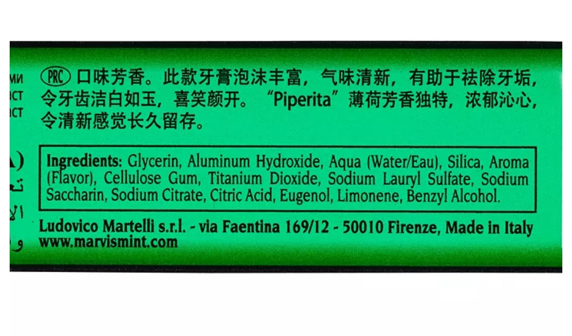 Glycerin, Aluminum Hydroxide, Aqua (Water/Eau), Silica, Aroma (Flavor), Cellulose Gum, Titanium Dioxide, Sodium Lauryl Sulfate, Sodium Saccharin, Sodium Citrate, Citric Acid, Eugenol, Limonene, Benzyl Alcohol.